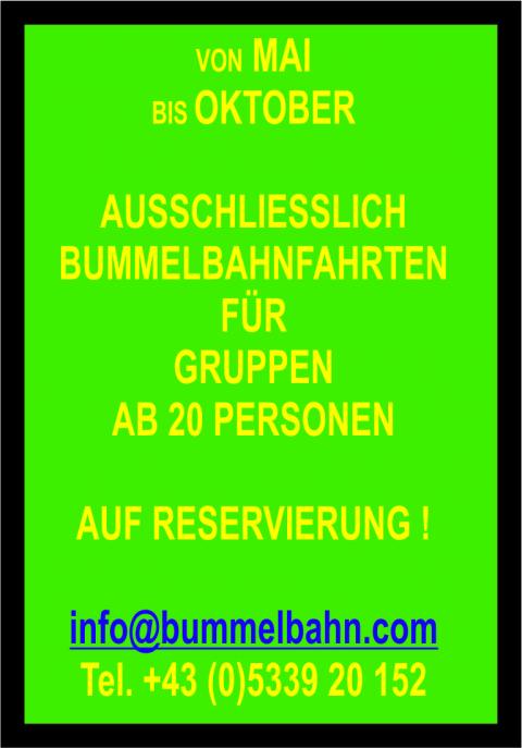 von MAI bis OKTOBERAUSSCHLIESSLICHBUMMELBAHNFAHRTENFÜR GRUPPEN AB 20 PERSONENAUF RESERVIERUNG !!+43 5339 20 152